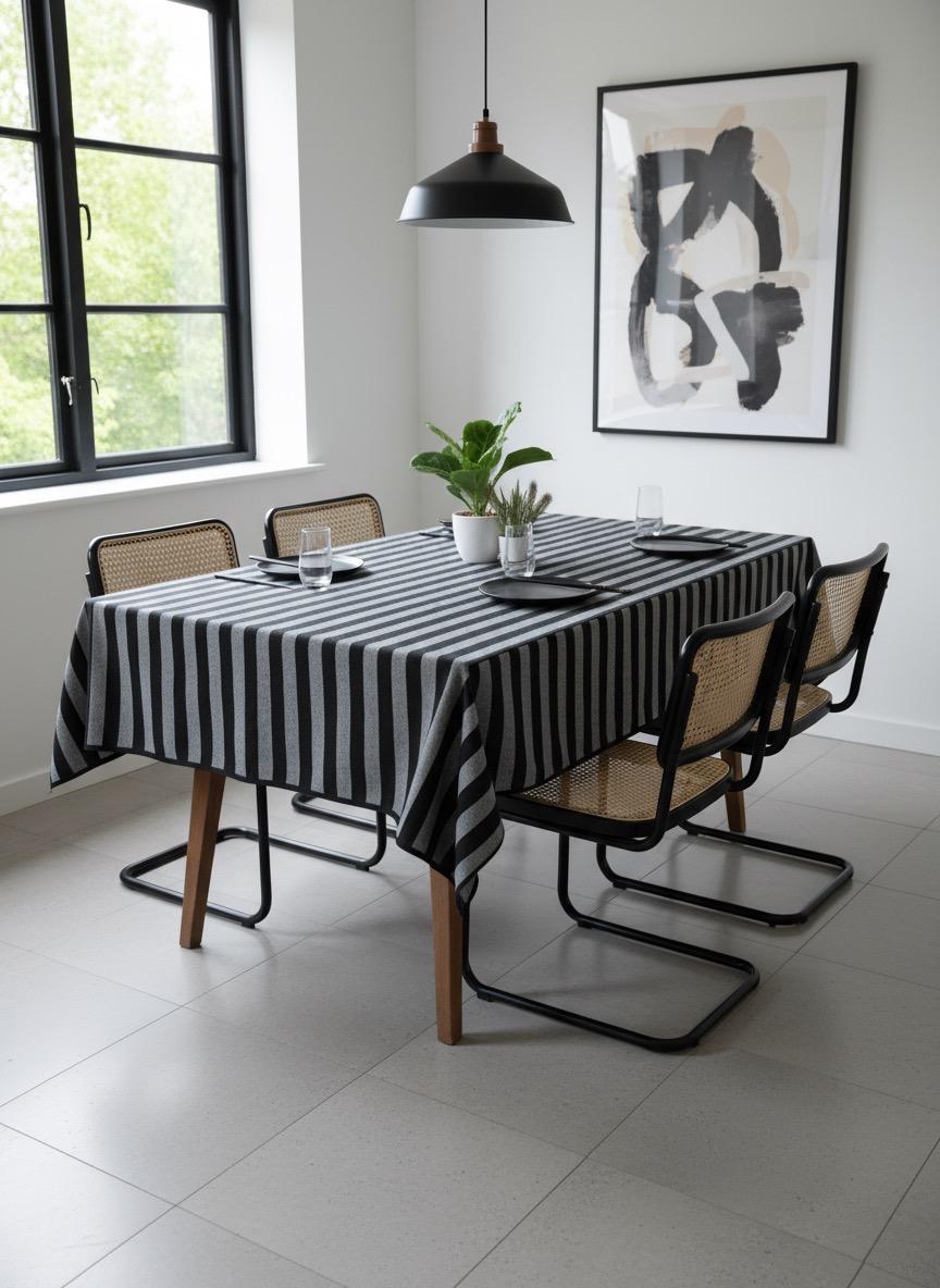 Geef je interieur een eigentijdse uitstraling met dit moderne zwart-grijs gestreepte tafelkleed van Bamar Lifestyle. Het tijdloze streeppatroon (ca. 4 cm breed) past perfect in zowel een moderne als klassieke inrichting en zorgt voor een sfeervolle gedekte tafel, elke dag opnieuw.