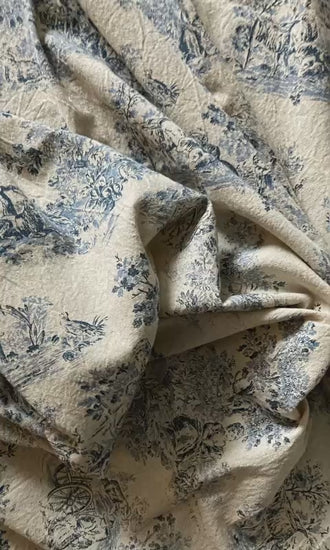 Breng Franse elegantie in huis met het Chateau Bleu tafelkleed – een prachtig crèmekleurig katoenen tafelkleed met een verfijnde lichtblauwe opdruk van een oud Frans tafereel. Dit design ademt rust, stijl en tijdloze charme, en vormt het perfecte middelpunt van een sfeervolle eettafel.